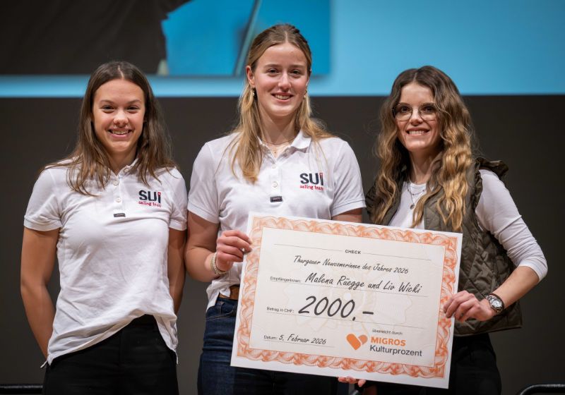 | Rahel Bachmann, Vertreterin des Migros-Kulturprozents Ostschweiz, überreichte am Thurgauer Sportpreis die Auszeichnung als Newcomerinnen des Jahres 2026 an die Seglerinnen Malena Rüegge und Liv Wicki.Thurgauer Sportförderer des Jahres.
